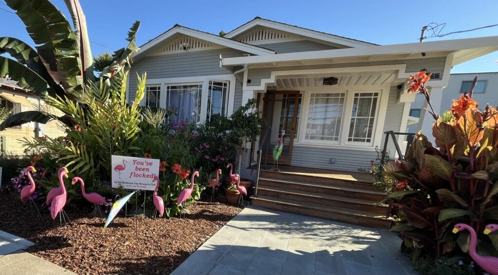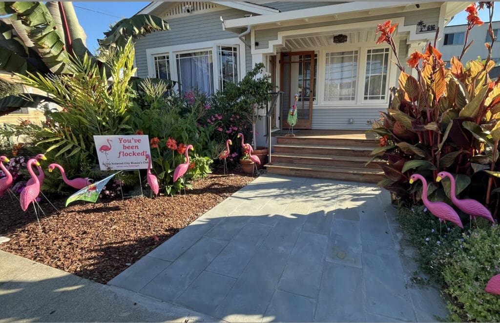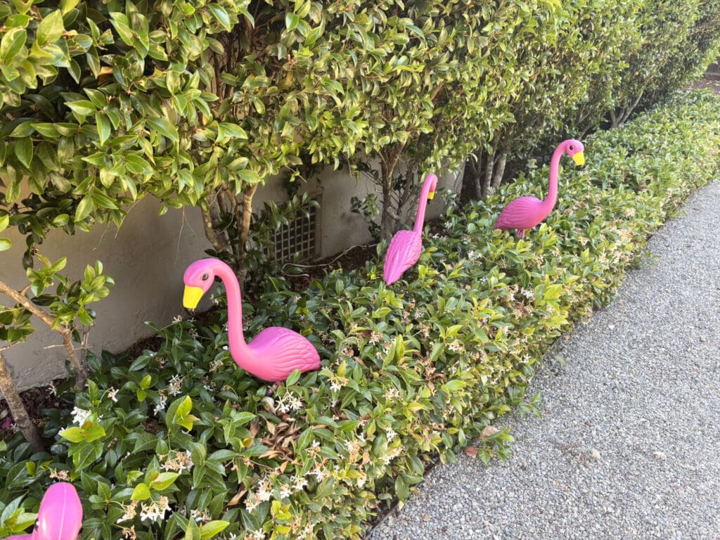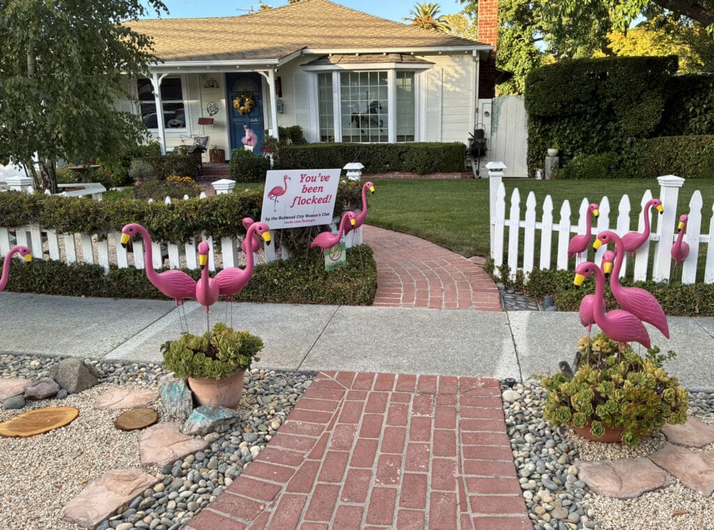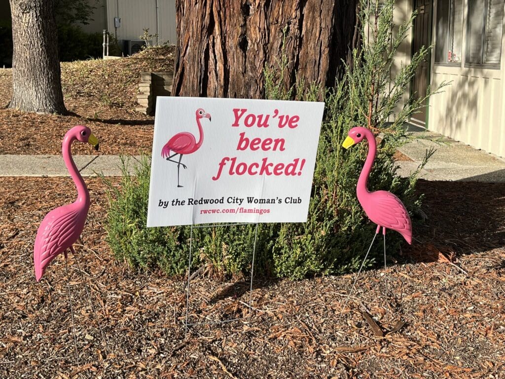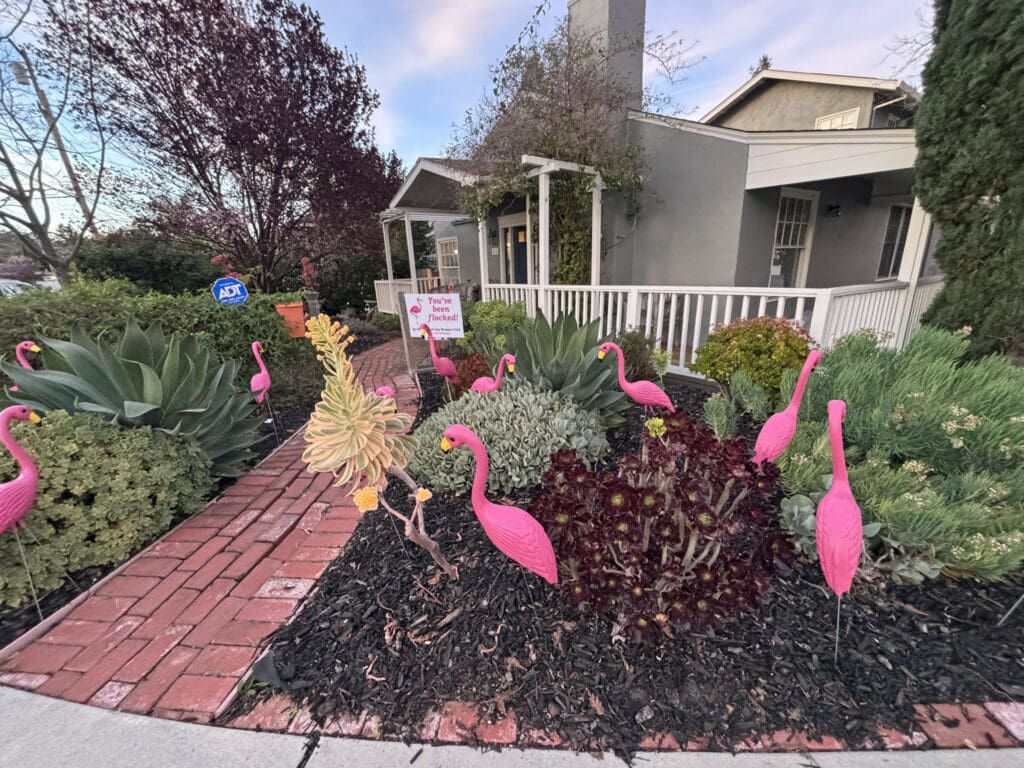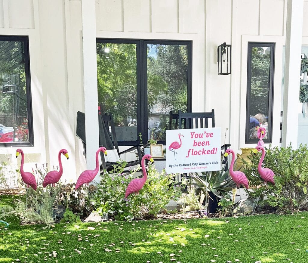 Your flockee receives 15 lawn flamingos, including one fully dressed lead bird. Each flock remains for two nights. Pick up is automatic and free.